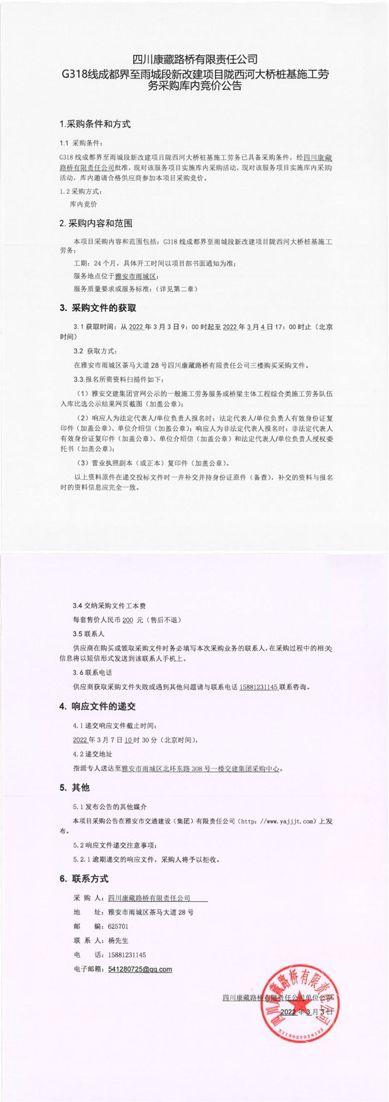 四川康藏路橋有限責(zé)任公司G318線成都界至雨城段新改建項(xiàng)目名山河大橋樁基施工勞務(wù)采購庫內(nèi)競價(jià)公告