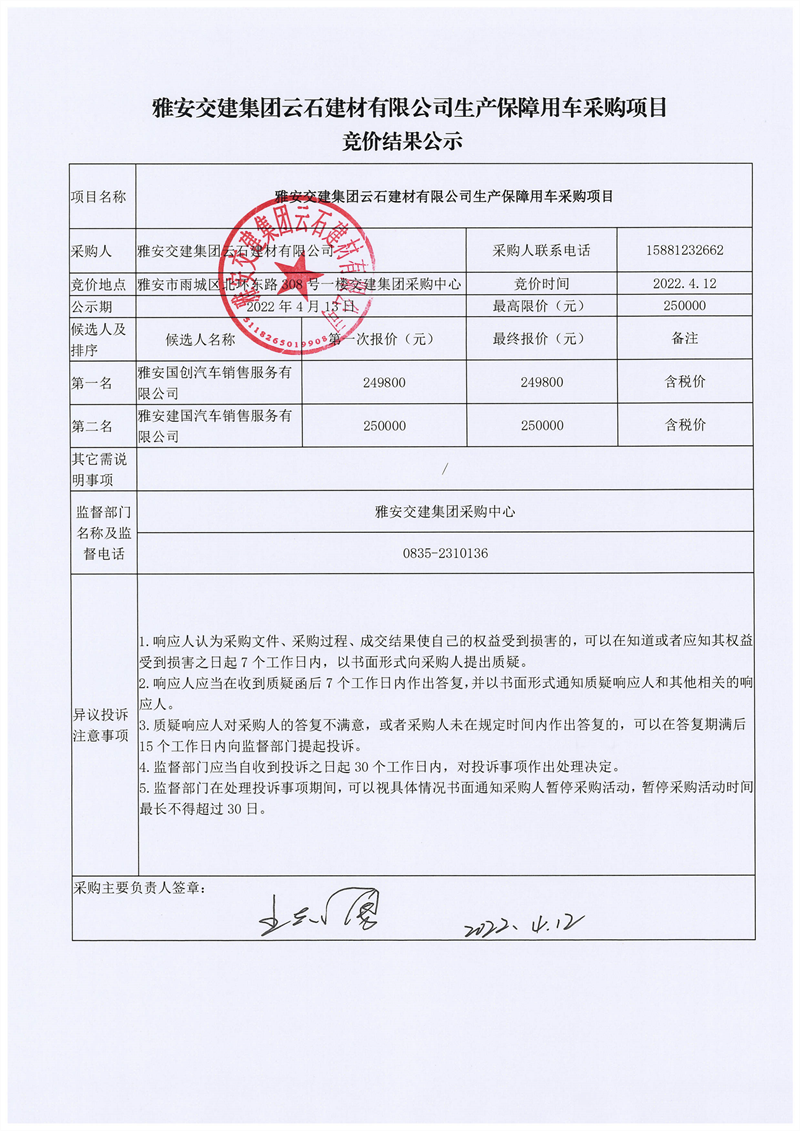 雅安交建集團(tuán)云石建材有限公司生產(chǎn)保障用車采購項(xiàng)目競價(jià)結(jié)果公示