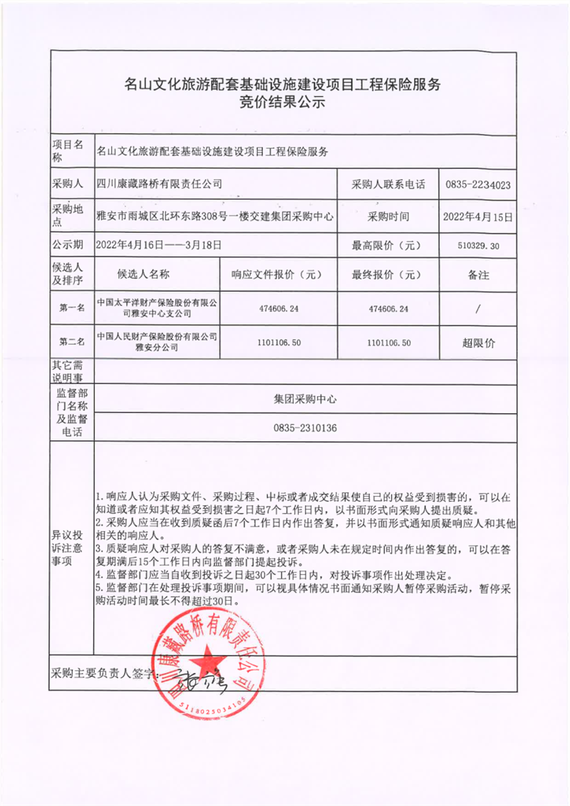 四川康藏路橋有限責(zé)任公司名山文化旅游配套基礎(chǔ)設(shè)施建設(shè)項(xiàng)目工程保險(xiǎn)服務(wù)競價(jià)結(jié)果公示