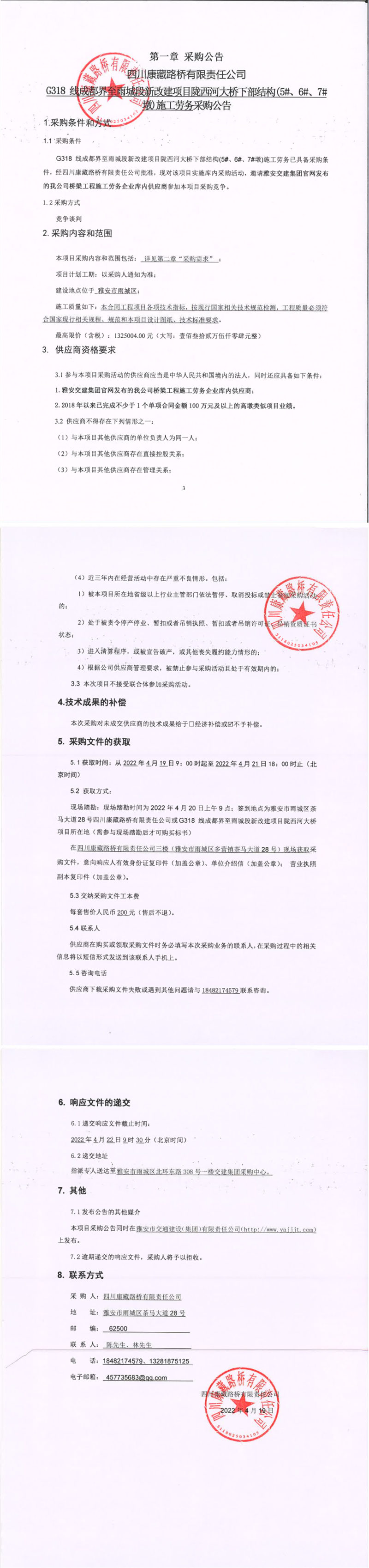 四川康藏路橋有限責(zé)任公司G318線成都界至雨城段新改建項(xiàng)目隴西河大橋下部結(jié)構(gòu)(5#、6#、7#墩)施工勞務(wù)采購公告