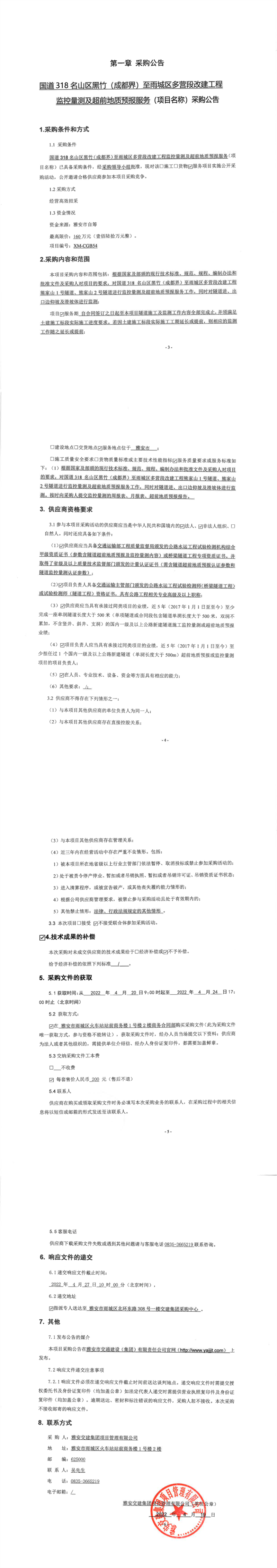 雅安交建集團項目管理有限公司國道318名山區(qū)黑竹(成都界)至雨城區(qū)多營段改建工程監(jiān)控量測及超前地質(zhì)預報服務(wù)采購公告