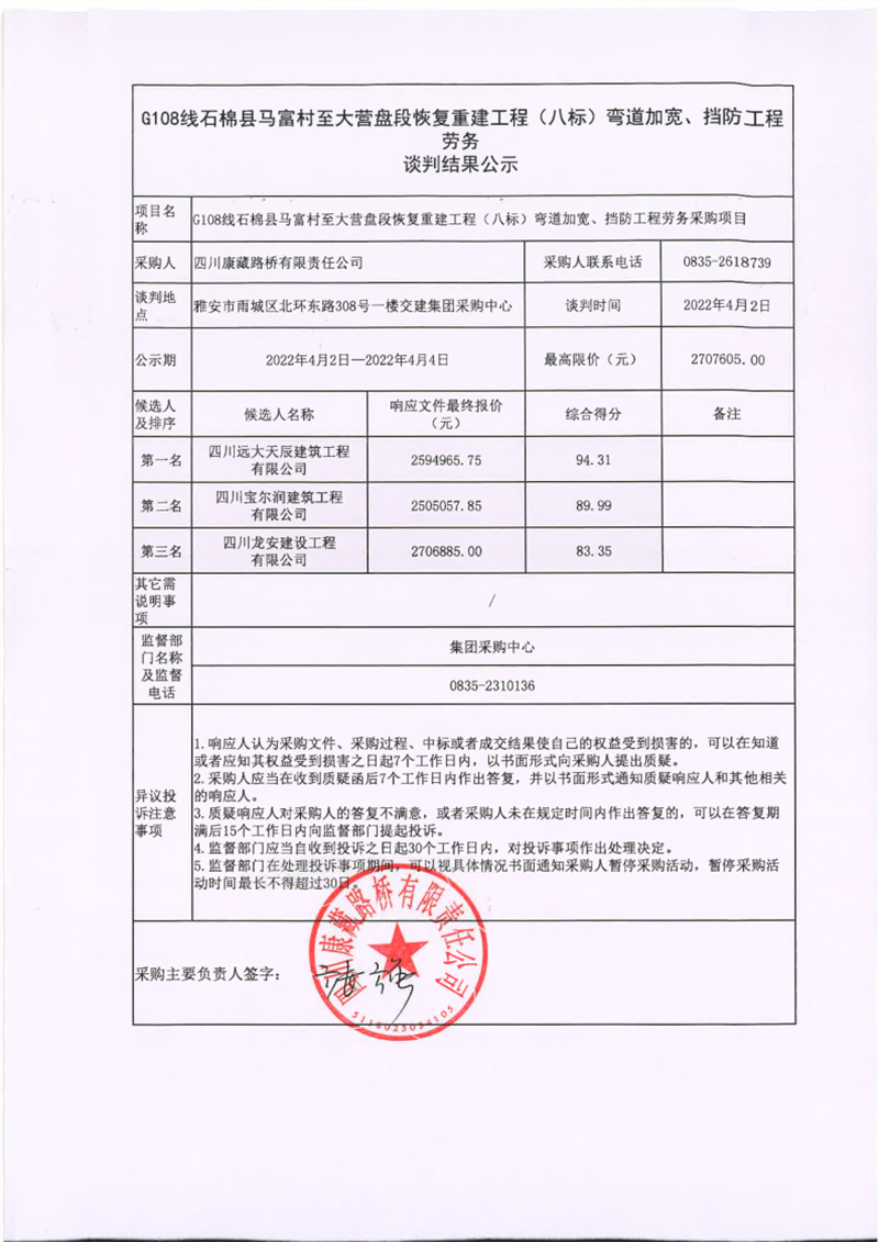 四川康藏路橋有限責任公司G108線石棉縣馬富村至大營盤段恢復重建工程(八標)彎道加寬、擋防工程勞務談判結(jié)果公示
