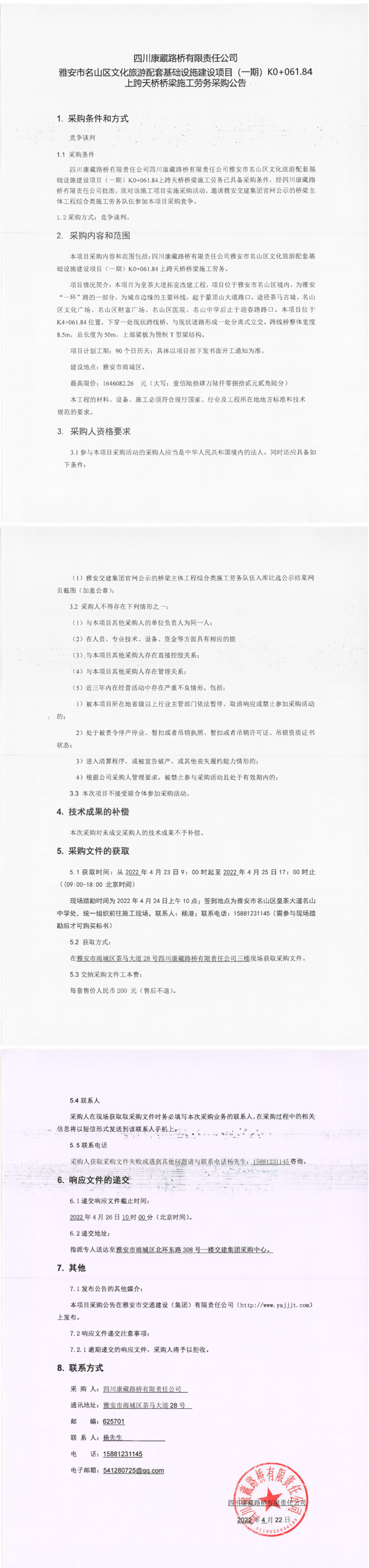 四川康藏路橋有限責(zé)任公司雅安市名山區(qū)文化旅游配套基礎(chǔ)設(shè)施建設(shè)項(xiàng)目(一期)K0+061.84上跨天橋橋梁施工勞務(wù)采購公告