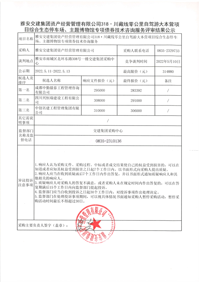 雅安交建集團(tuán)資產(chǎn)經(jīng)營管理有限公司318·川藏線零公里自駕游大本營項目綜合生態(tài)停車場、主題博物館專項債券技術(shù)咨詢服務(wù)評審結(jié)果公示