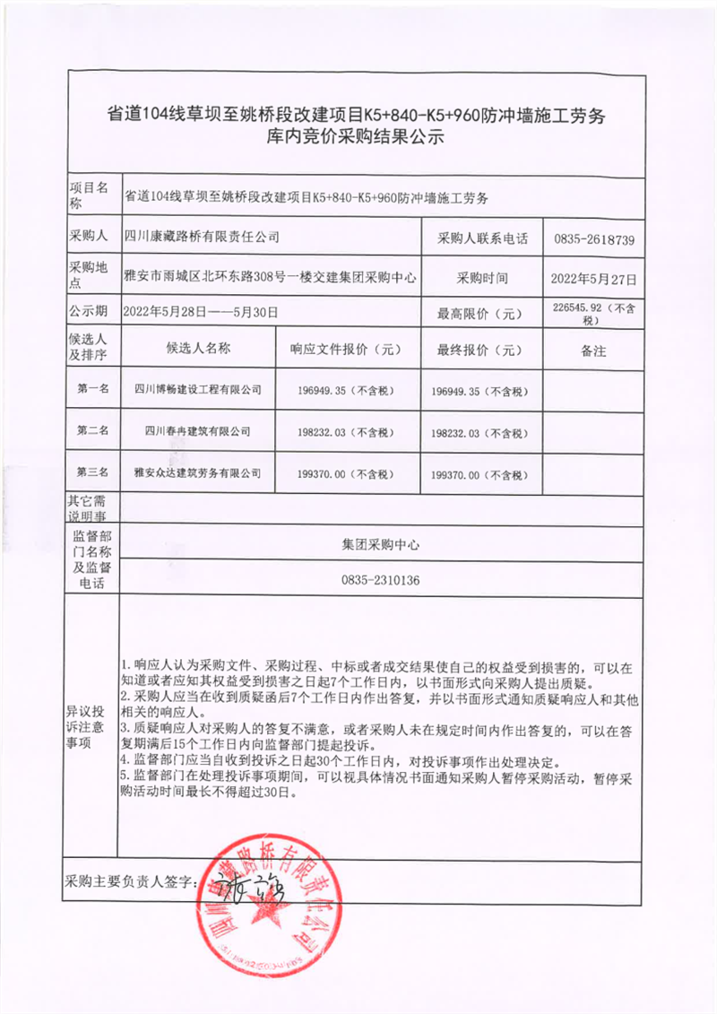 四川康藏路橋有限責(zé)任公司省道104線草壩至姚橋段改建項目K5+840-K5+960防沖墻施工勞務(wù)庫內(nèi)競價采購結(jié)果公示