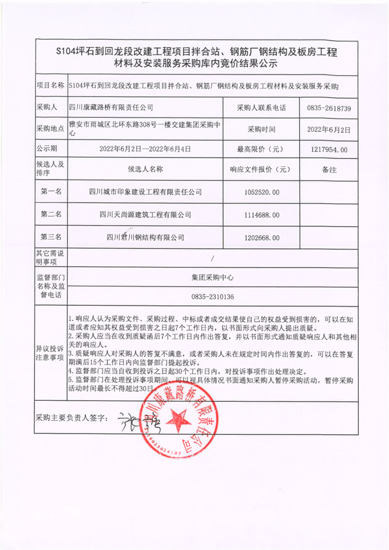 四川康藏路橋有限責(zé)任公司S104坪石到回龍段改建工程項(xiàng)目拌合站、鋼筋廠鋼結(jié)構(gòu)及板房工程材料及安裝服務(wù)庫(kù)內(nèi)競(jìng)價(jià)結(jié)果公示