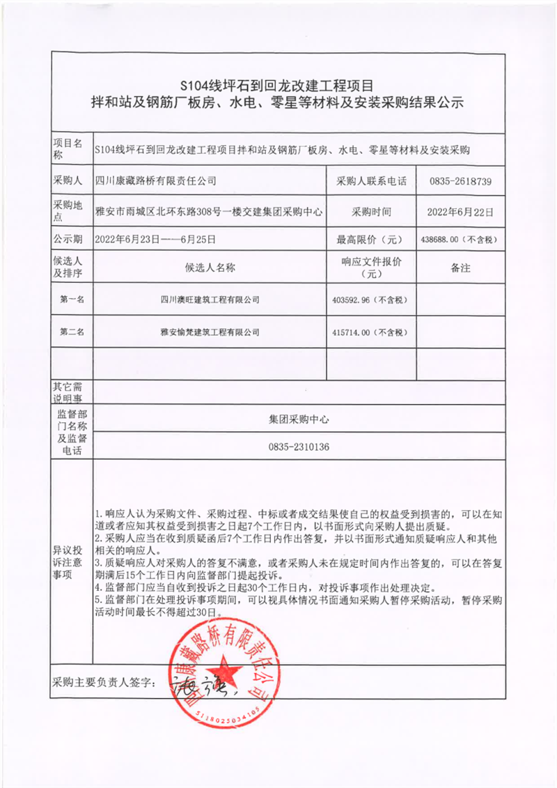 四川康藏路橋有限責任公司S104線坪石到回龍改建工程項目拌和站及鋼筋廠板房、水電、零星等材料及安裝采購結(jié)果公示