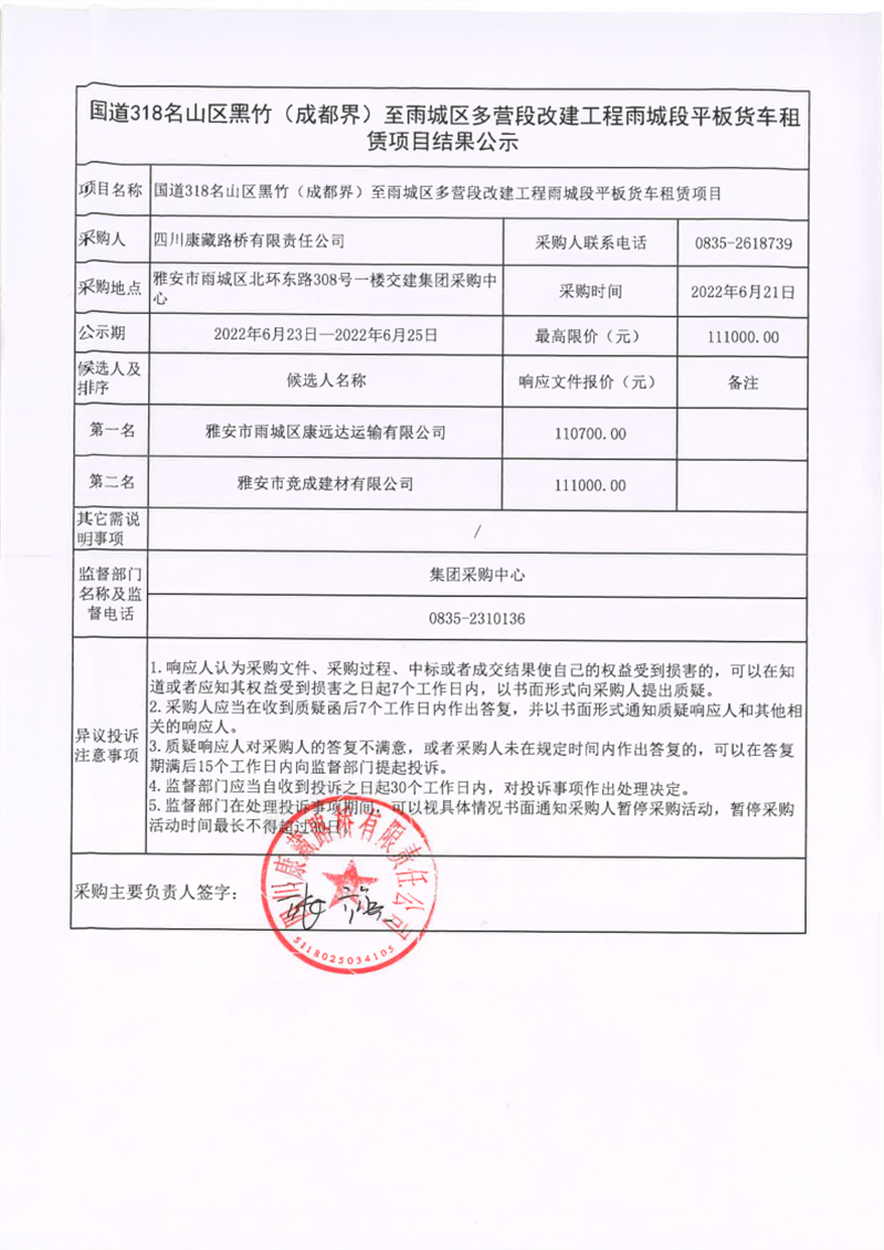 四川康藏路橋有限責(zé)任公司國道318名山區(qū)黑竹(成都界)至雨城區(qū)多營段改建工程雨城段平板貨車租賃項目結(jié)果公示