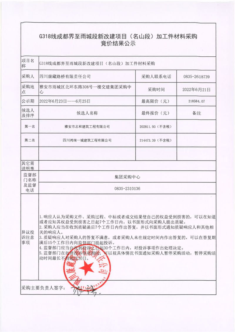 四川康藏路橋有限責任公司G318線成都界至雨城段新改建項目(名山段)加工件材料采購競價結果公示