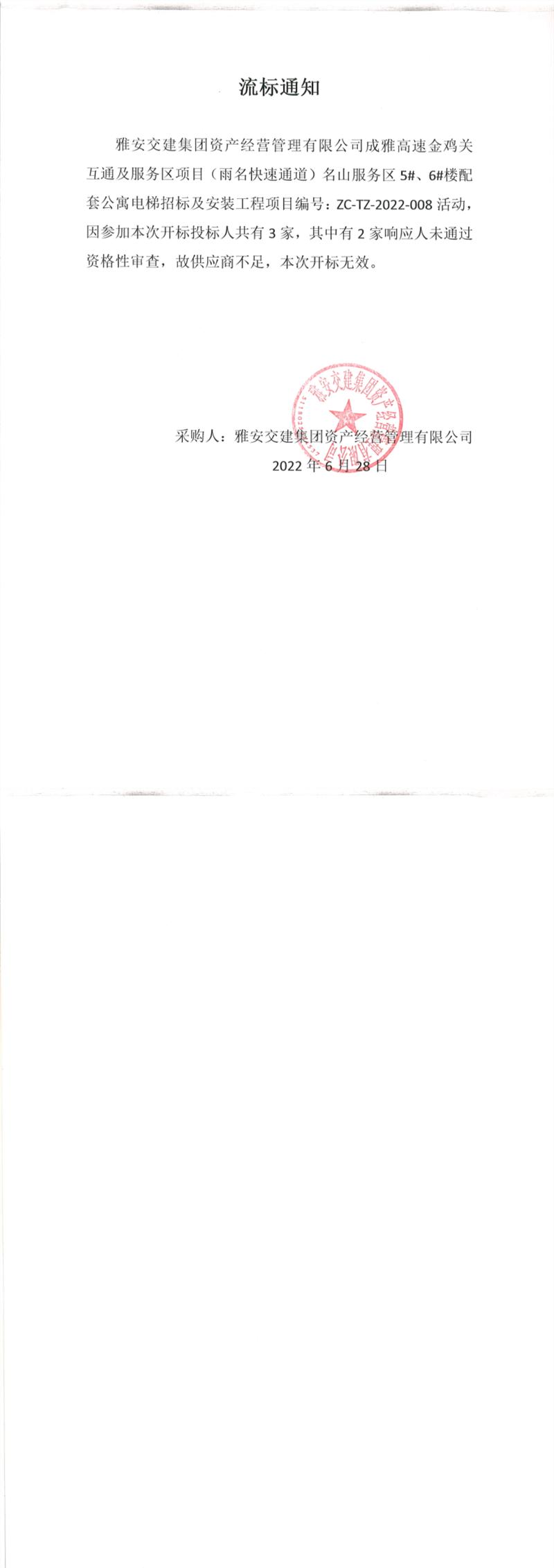 雅安交建集團資產經(jīng)營管理有限公司成雅高速金雞關互通及服務區(qū)(雨名快速通道)名山服務區(qū)5#、6#樓配套公寓電梯招標及安裝工程項目流標通知