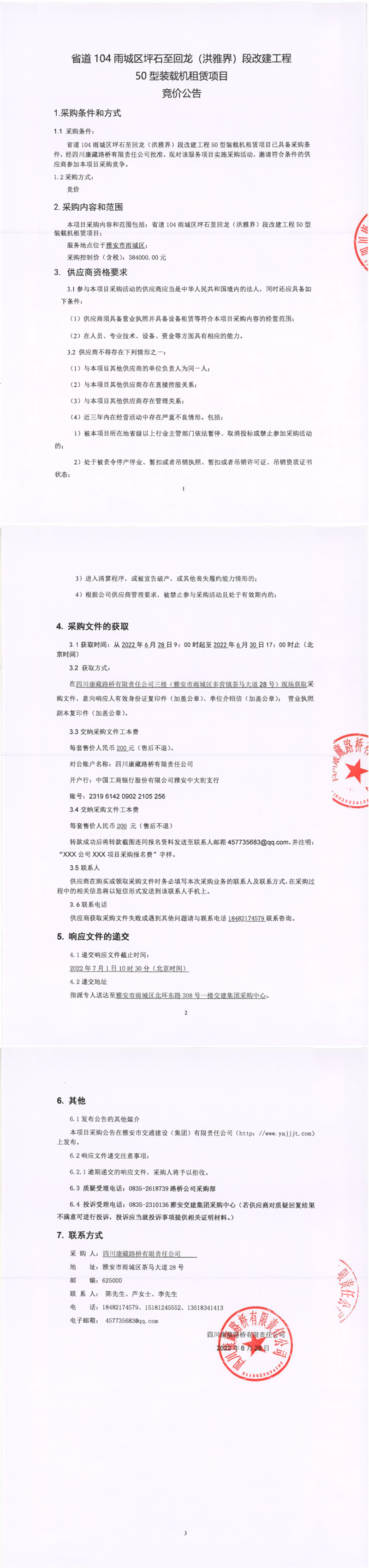 四川康藏路橋有限責(zé)任公司省道104雨城區(qū)坪石至回龍(洪雅界)段改建工程50型裝載機(jī)租賃項(xiàng)目競價(jià)公告