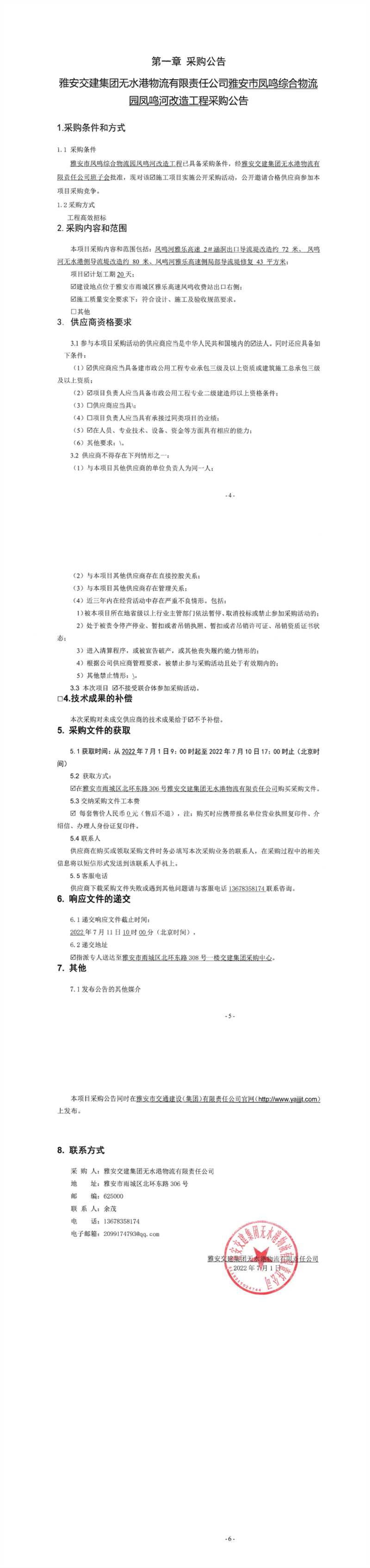 雅安交建集團無水港物流有限責(zé)任公司雅安市鳳鳴綜合物流園鳳鳴河改造工程采購公告