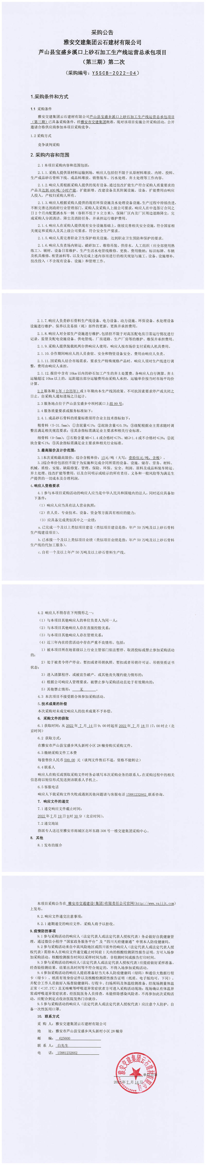 雅安交建集團(tuán)云石建材有限公司蘆山縣寶盛鄉(xiāng)溪口上砂石加工生產(chǎn)線運(yùn)營總承包項目(第三期)第二次采購公告