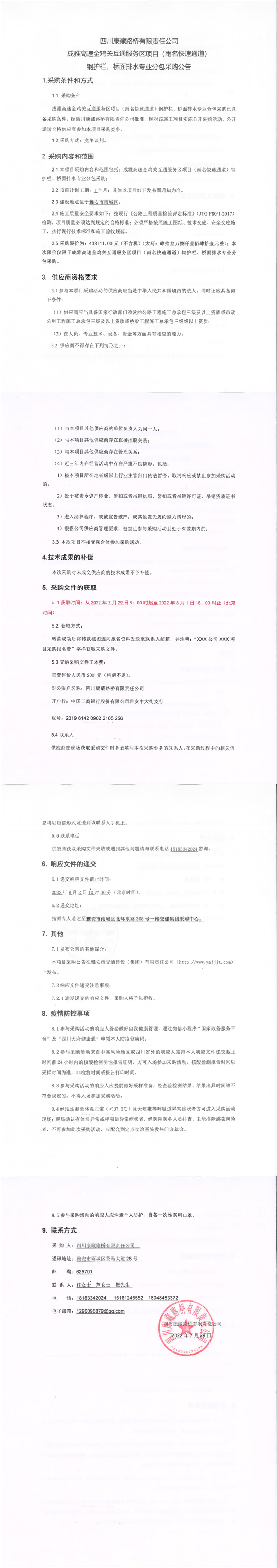 四川康藏路橋有限責(zé)任公司成雅高速金雞關(guān)互通服務(wù)區(qū)項(xiàng)目(雨名快速通道)鋼護(hù)欄、橋面攔水專業(yè)分包采購(gòu)公告