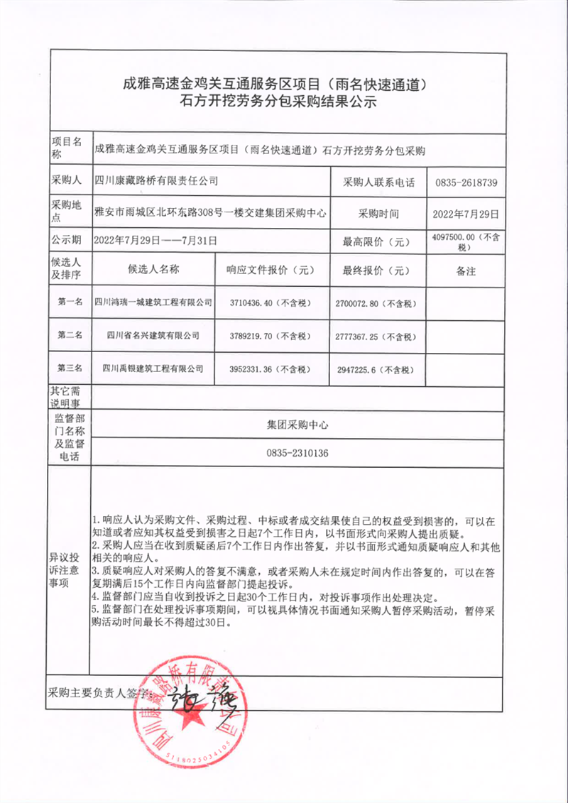 四川康藏路橋有限責(zé)任公司成雅高速金雞關(guān)互通服務(wù)區(qū)項(xiàng)目(雨名快速通道)石方開挖勞務(wù)分包采購結(jié)果公示