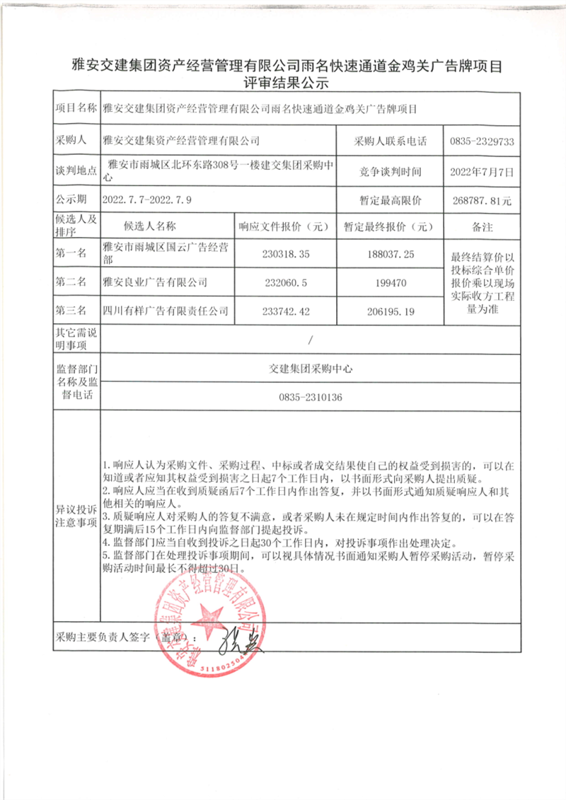 雅安交建集團資產(chǎn)經(jīng)營管理有限公司雨名快速通道金雞關廣告牌項目評審結(jié)果公示
