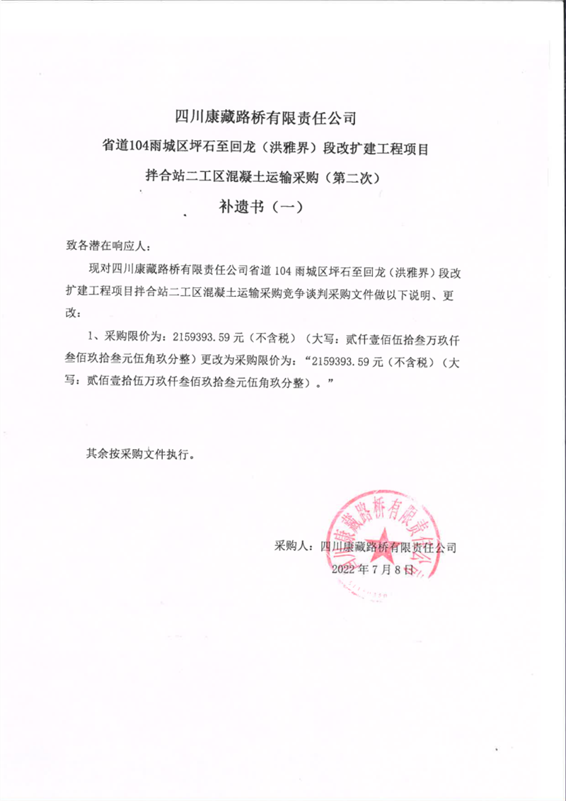 四川康藏路橋有限責任公司省道104線雨城區(qū)坪石至回龍(洪雅界)段改建工程項目拌合站二工區(qū)混凝土運輸采購(第二次)補遺書(一)