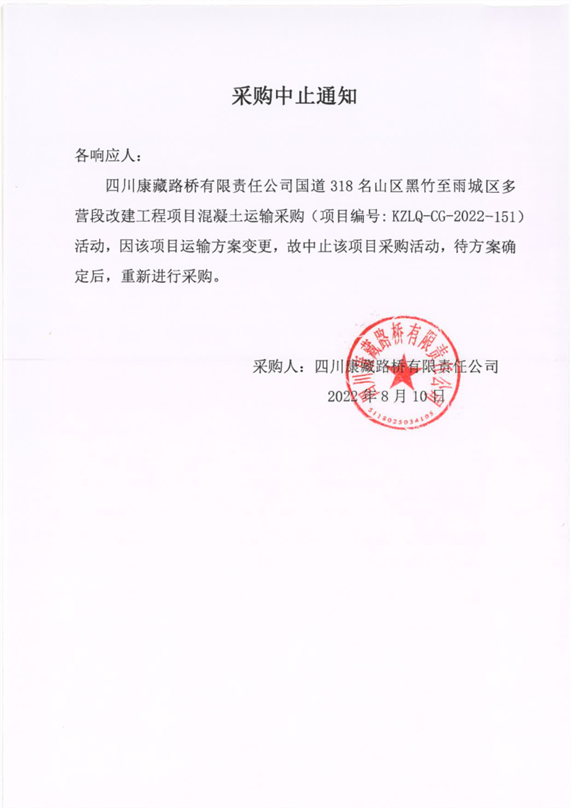 四川康藏路橋有限責(zé)任公司國道318名山區(qū)黑竹至雨城區(qū)多營段改建工程項目混凝土運輸采購中止通知