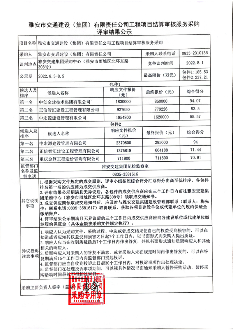 雅安市交通建設(shè)(集團(tuán))有限責(zé)任公司工程項(xiàng)目結(jié)算審核服務(wù)采購評(píng)審結(jié)果公示