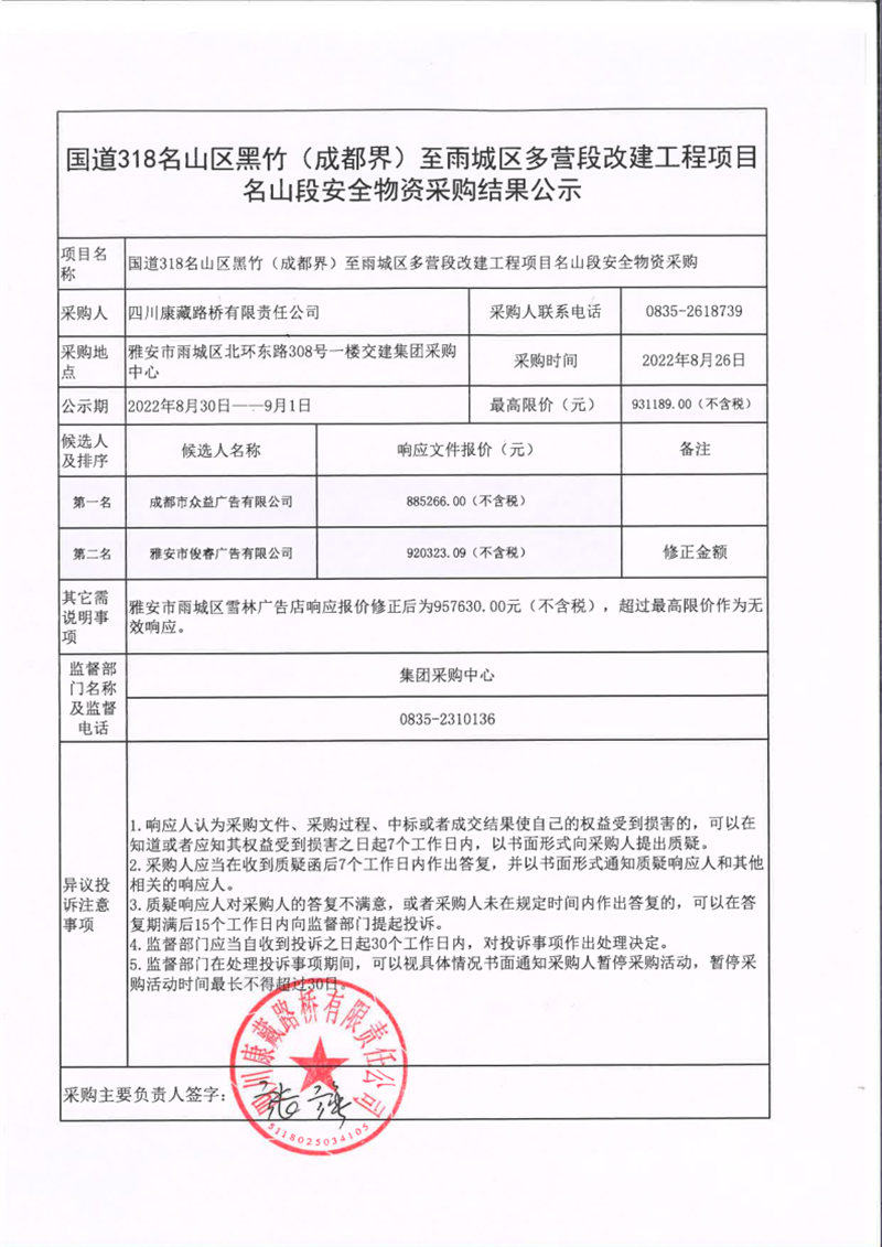 四川康藏路橋有限責(zé)任公司國道318名山區(qū)黑竹(成都界)至雨城區(qū)多營段改建工程項目名山段安全物資采購結(jié)果公示