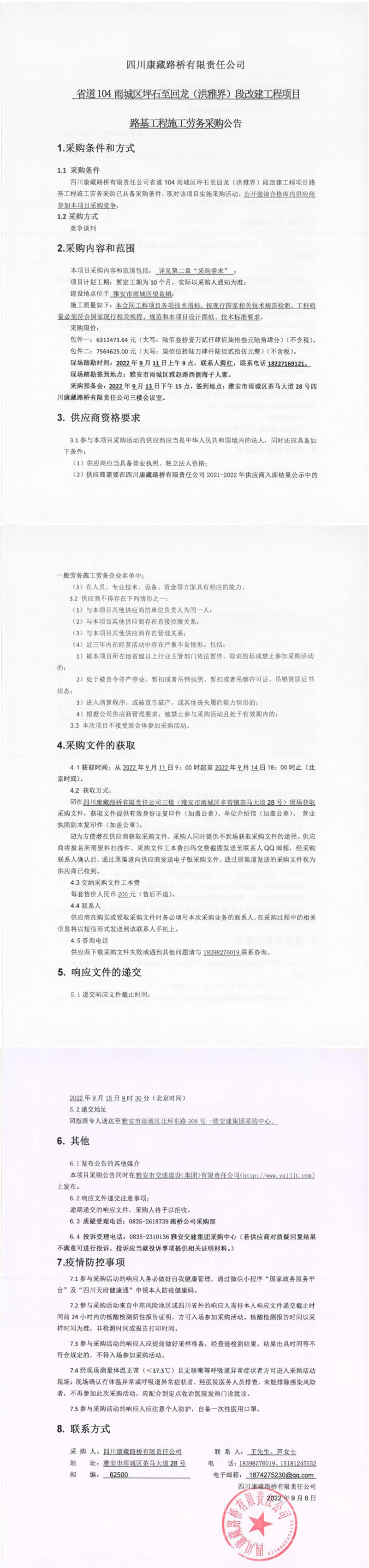 四川康藏路橋有限責(zé)任公司省道104雨城區(qū)坪石至回龍(洪雅界)段改建工程項(xiàng)目路基工程施工勞務(wù)采購公告