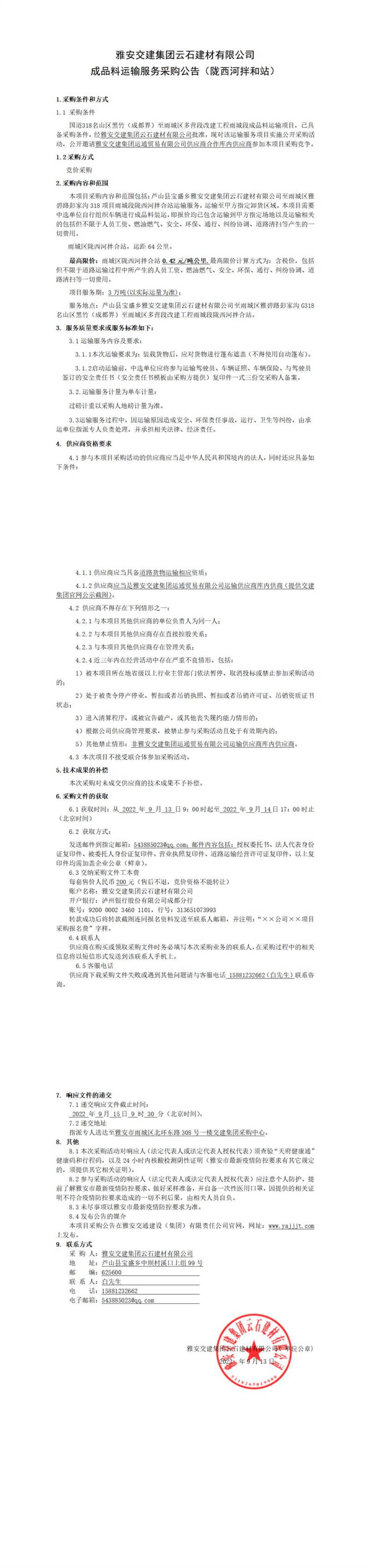 雅安交建集團(tuán)云石建材有限公司成品料運(yùn)輸服務(wù)采購公告(隴西河拌和站)