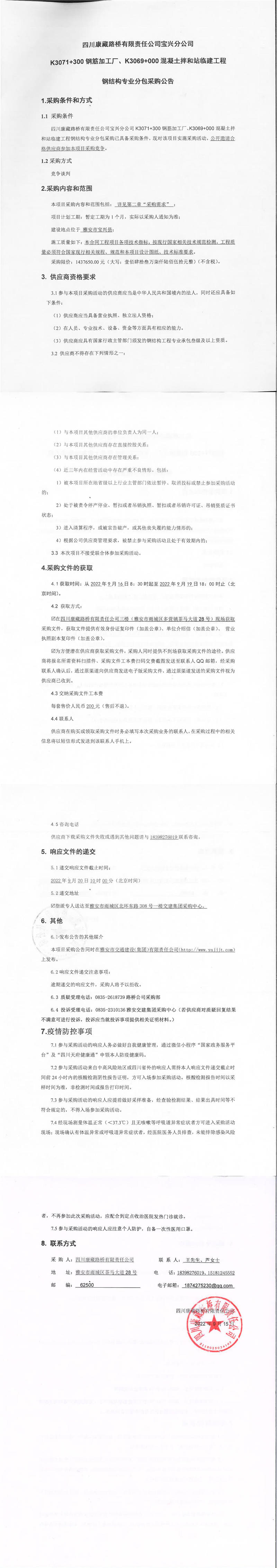 四川康藏路橋有限責(zé)任公司寶興分公司K3071+300鋼筋加工廠、K3069+000混凝土拌和站臨建工程鋼結(jié)構(gòu)專業(yè)分包采購(gòu)公告