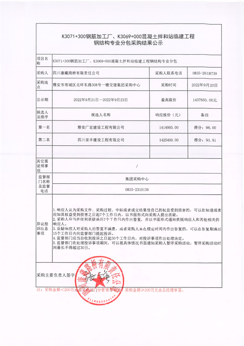 四川康藏路橋有限責任公司K3071+300鋼筋加工廠、K3069+000混凝土拌和站臨建工程鋼結(jié)構(gòu)專業(yè)分包采購結(jié)果公示