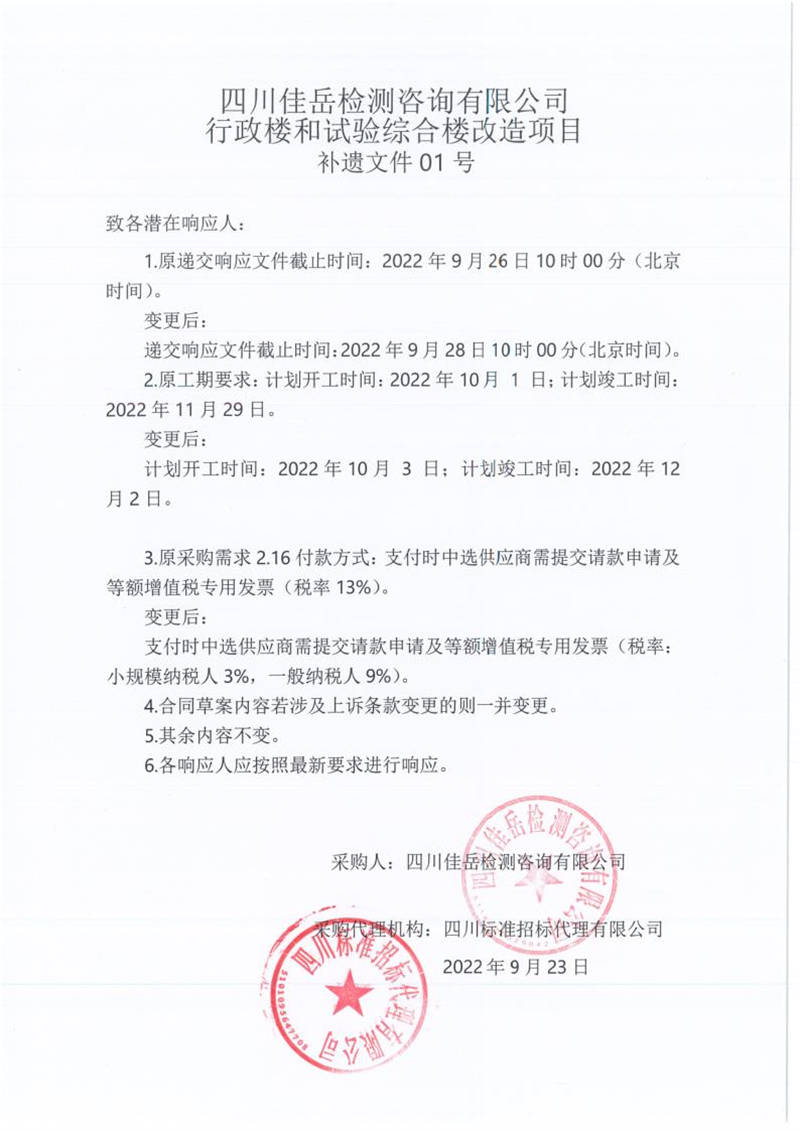 四川佳岳檢測咨詢有限公司行政樓和試驗綜合樓改造項目補遺文件01號