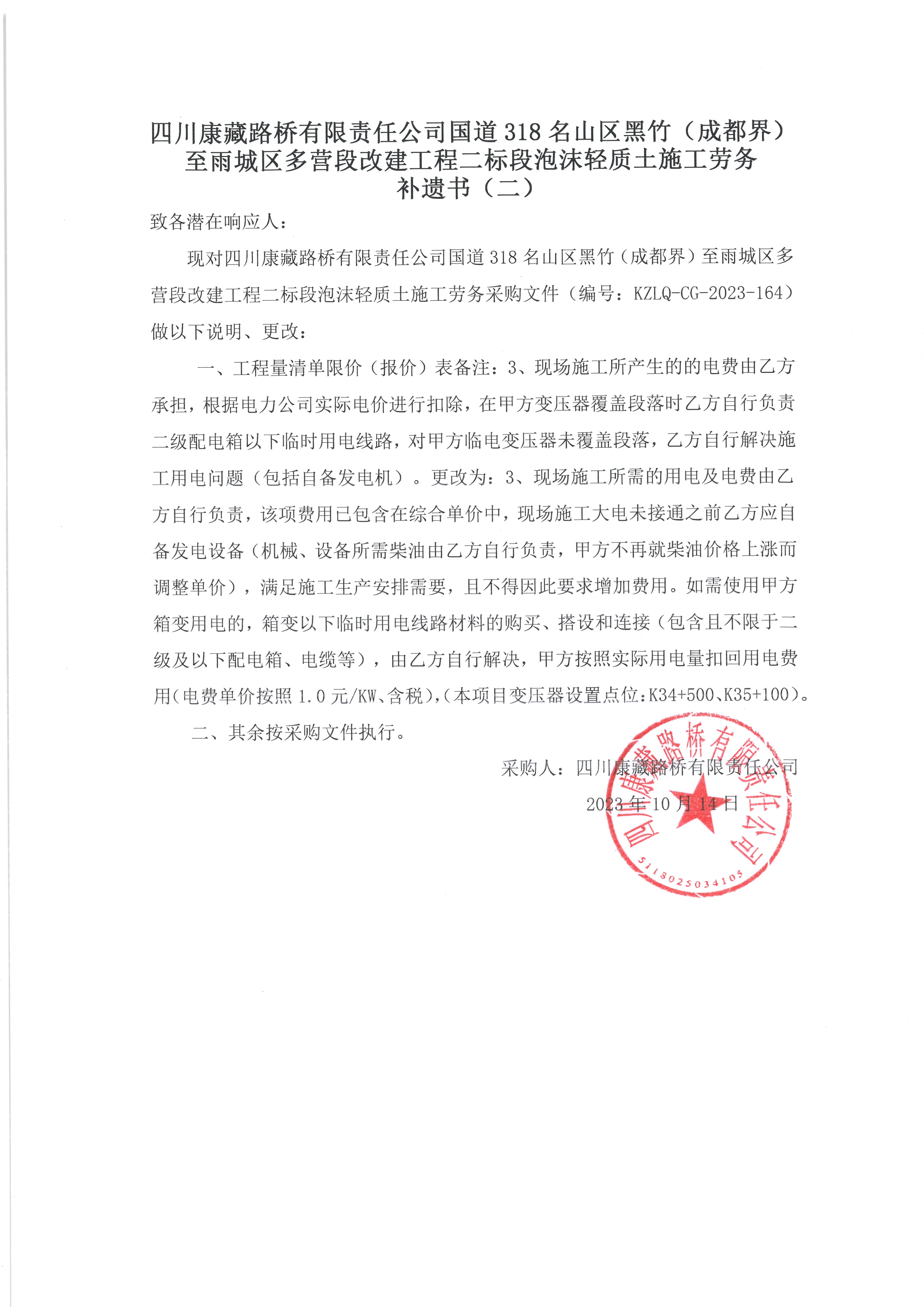 四川康藏路橋有限責(zé)任公司國(guó)道318名山區(qū)黑竹(成都界)至雨城區(qū)多營(yíng)段改建工程二標(biāo)段泡沫輕質(zhì)土施工勞務(wù) 補(bǔ)遺書(二)