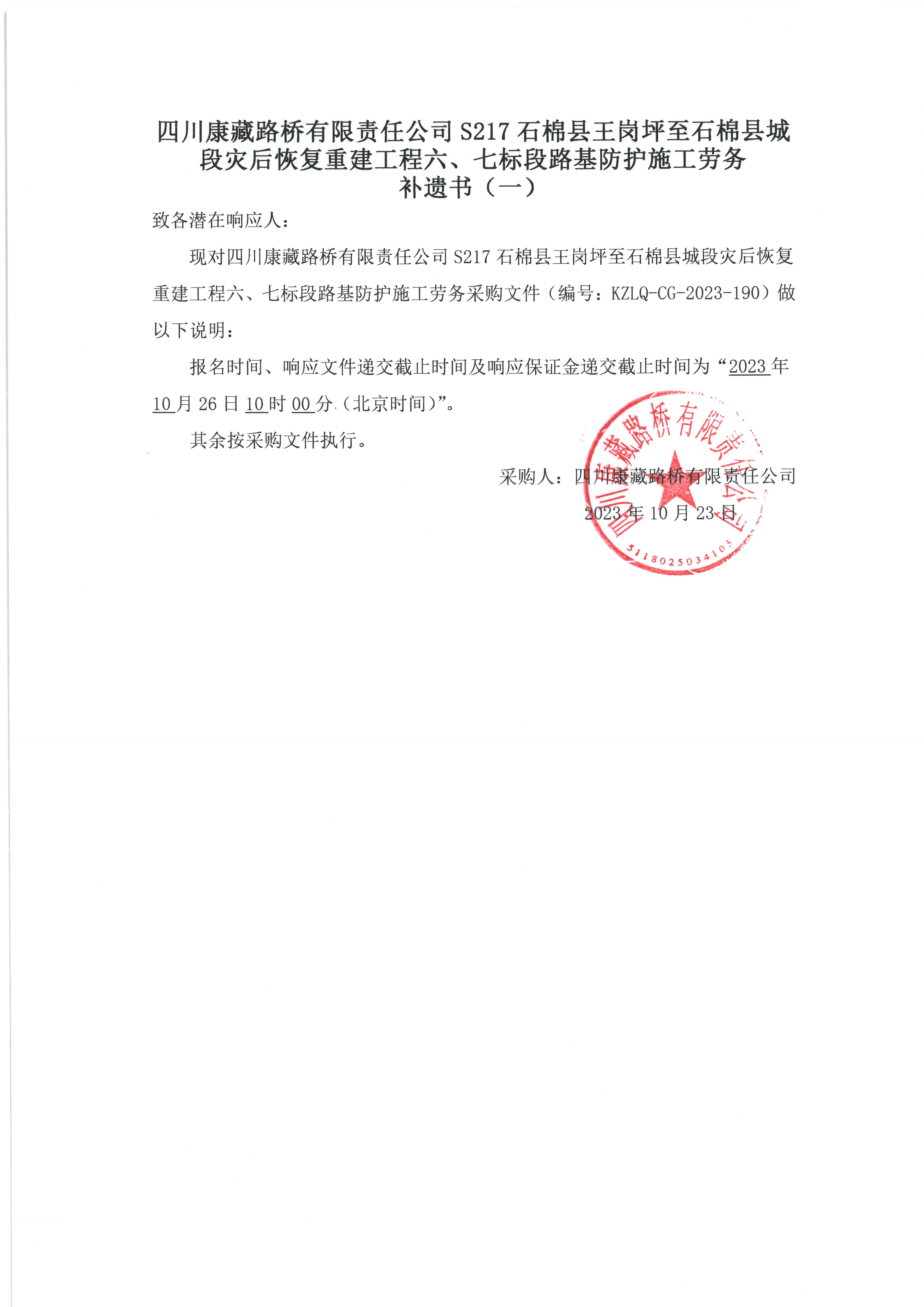 四川康藏路橋有限責任公司S217石棉縣王崗坪至石棉縣城段災(zāi)后恢復(fù)重建工程六、七標段路基防護施工勞務(wù) 補遺書(一)