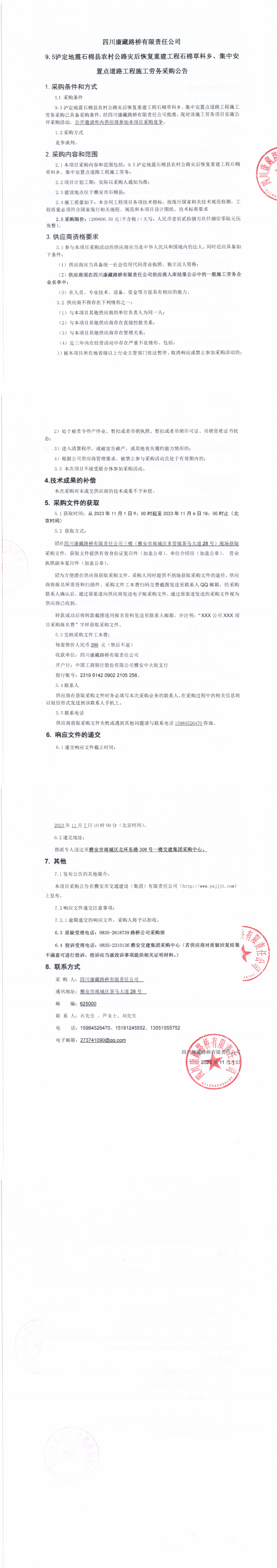 四川康藏路橋有限責(zé)任公司9.5瀘定地震石棉縣農(nóng)村公路災(zāi)后恢復(fù)重建工程石棉草科鄉(xiāng)、集中安置點(diǎn)道路工程施工勞務(wù)采購公告