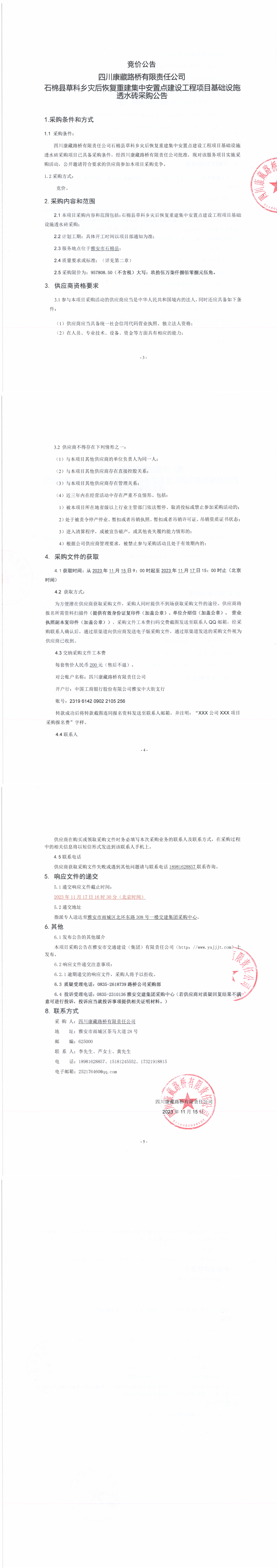 四川康藏路橋有限責(zé)任公司石棉縣草科鄉(xiāng)災(zāi)后恢復(fù)重建集中安置點建設(shè)工程項目基礎(chǔ)設(shè)施透水磚采購公告