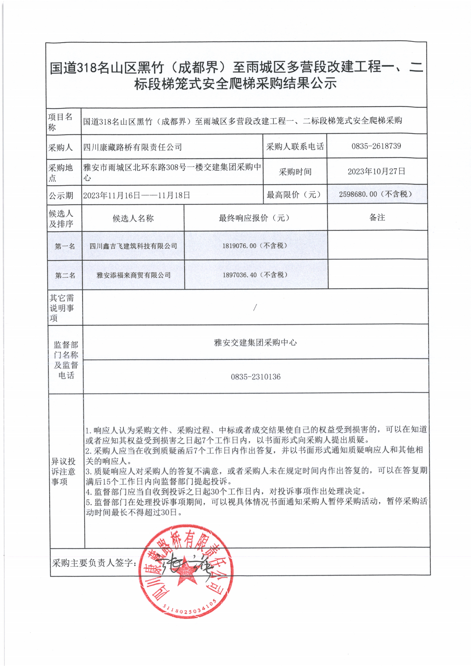 四川康藏路橋有限責任公司國道318名山區(qū)黑竹(成都界)至雨城區(qū)多營段改建工程一、二標段梯籠式安全爬梯采購結(jié)果公示