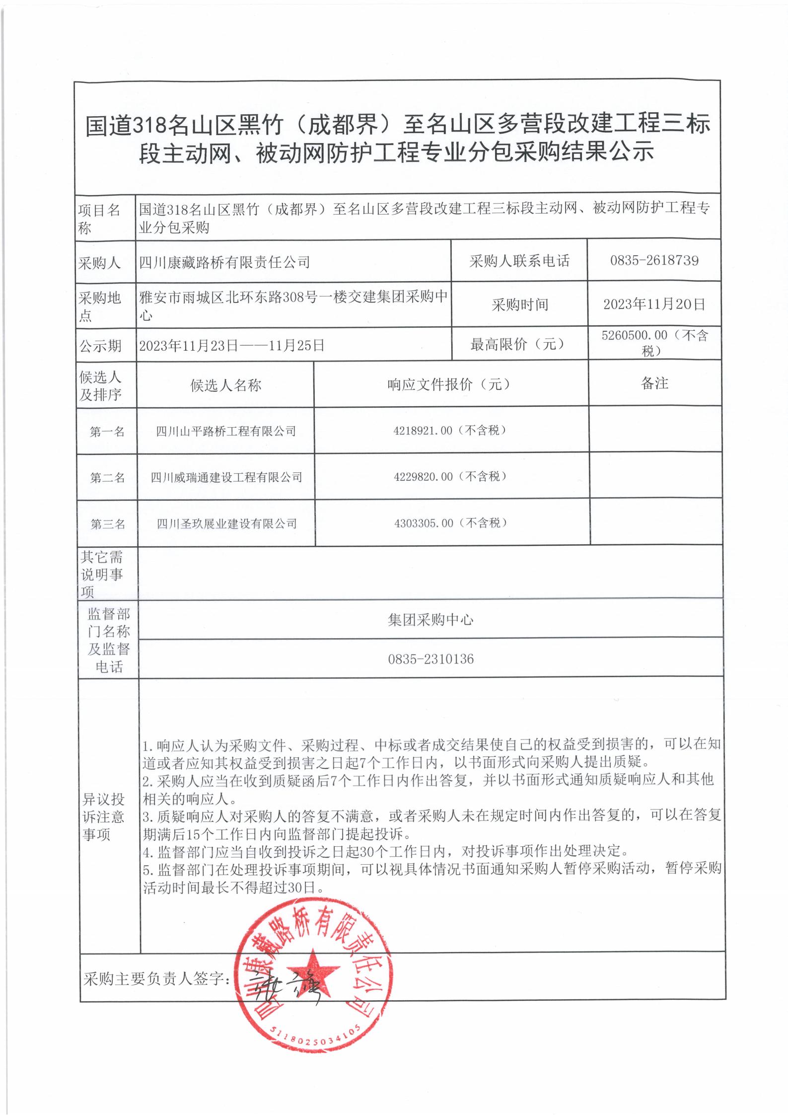 四川康藏路橋有限責任公司國道318名山區(qū)黑竹(成都界)至名山區(qū)多營段改建工程三標段主動網(wǎng)、被動網(wǎng)防護工程專業(yè)分包采購結(jié)果公示