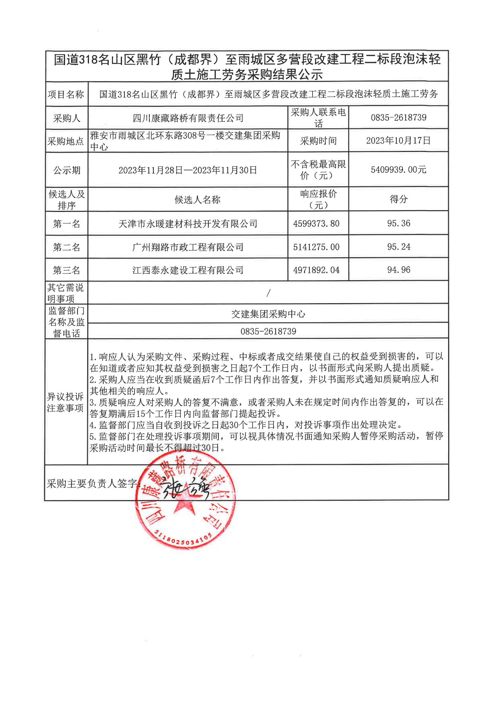 四川康藏路橋有限責(zé)任公司國(guó)道318名山區(qū)黑竹(成都界)至雨城區(qū)多營(yíng)段改建工程二標(biāo)段泡沫輕質(zhì)土施工勞務(wù)采購結(jié)果公示