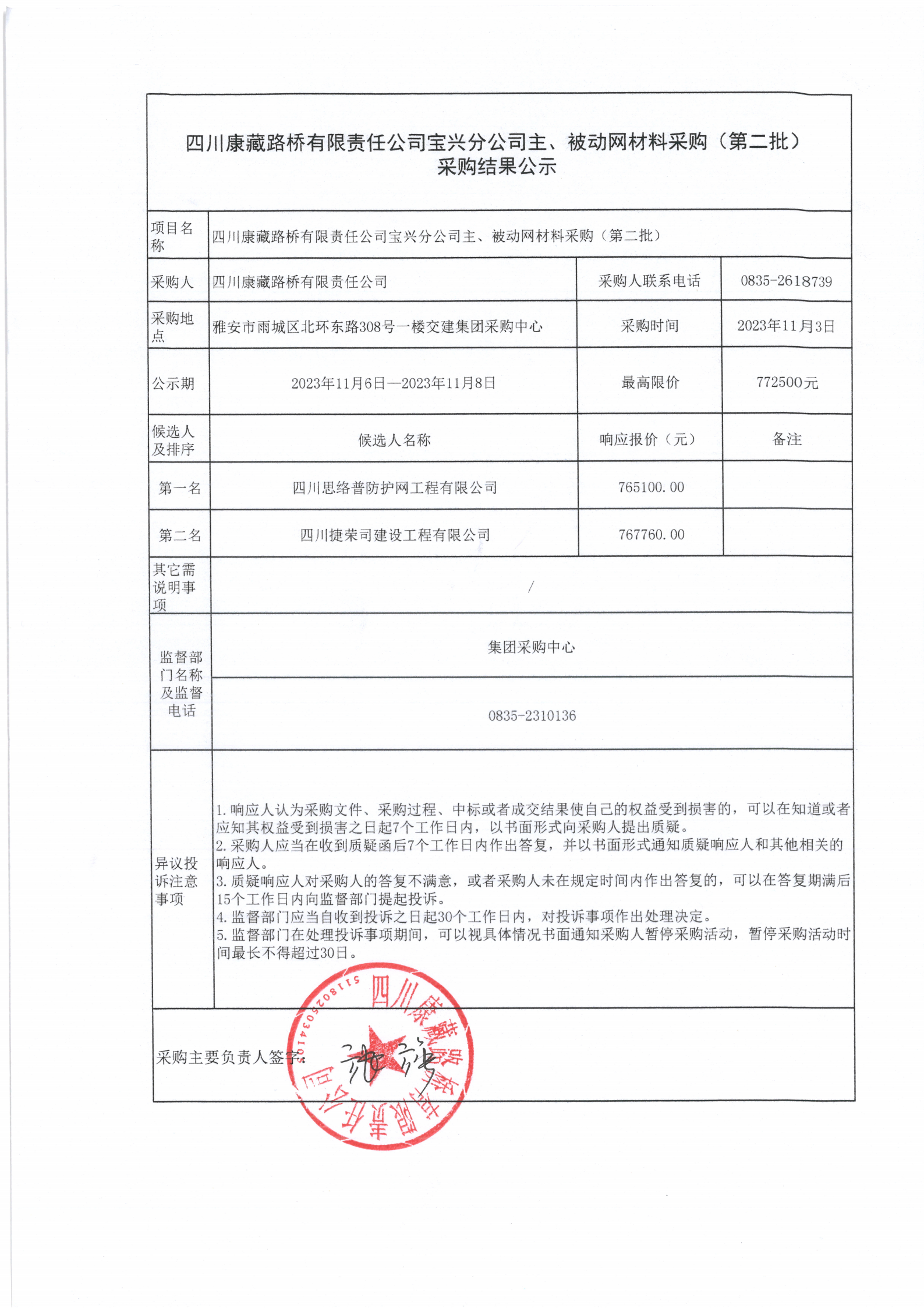 四川康藏路橋有限責任公司寶興分公司主、被動網(wǎng)材料采購(第二批)采購結(jié)果公示