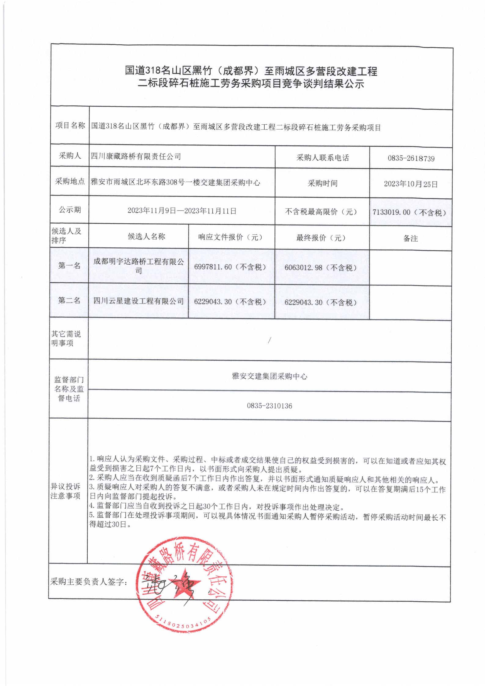 四川康藏路橋有限責任公司國道318名山區(qū)黑竹(成都界)至雨城區(qū)多營段改建工程二標段碎石樁施工勞務采購項目競爭談判結果公示