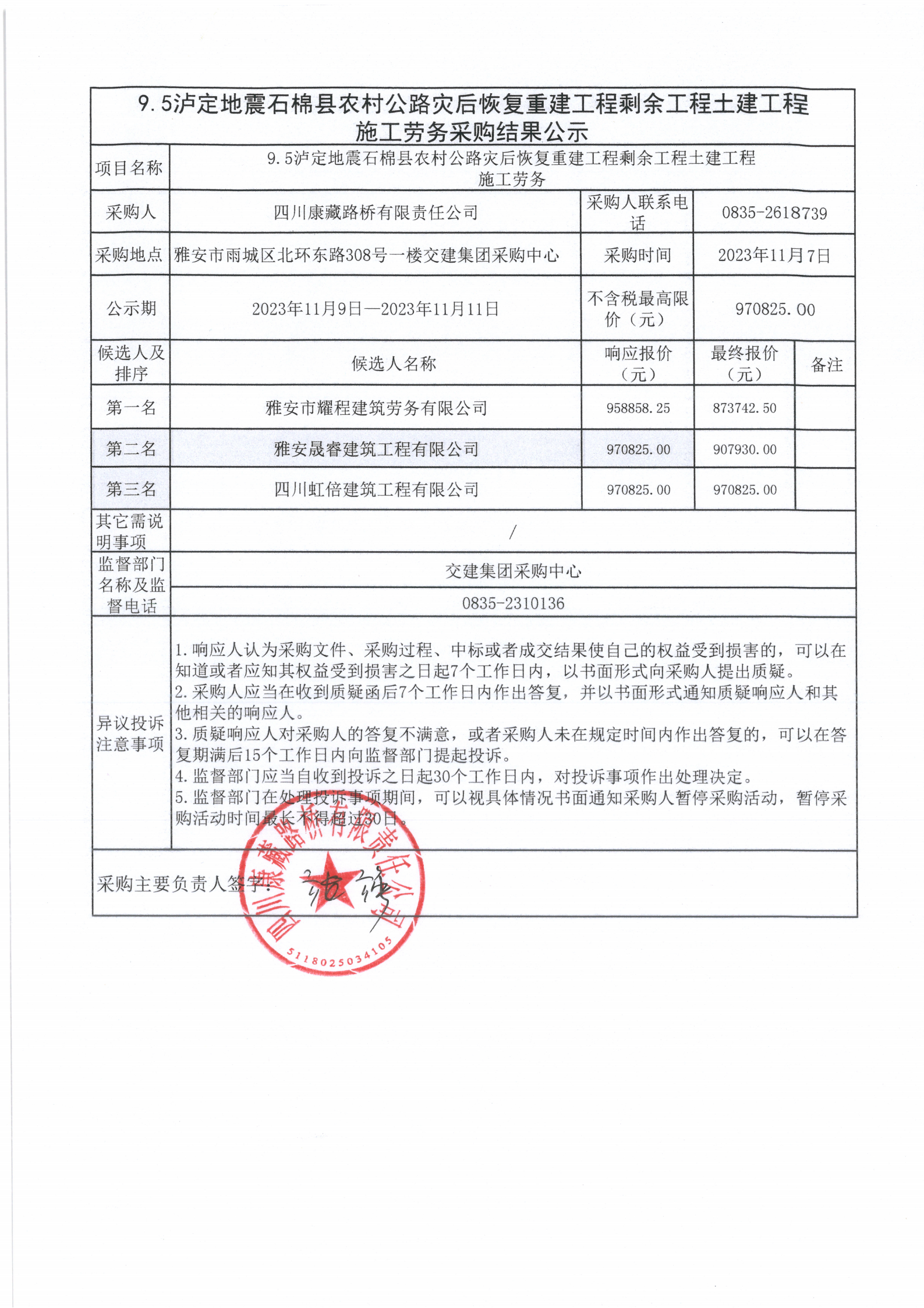 四川康藏路橋有限責(zé)任公司9.5瀘定地震石棉縣農(nóng)村公路災(zāi)后恢復(fù)重建工程剩余工程土建工程施工勞務(wù)采購(gòu)結(jié)果公示