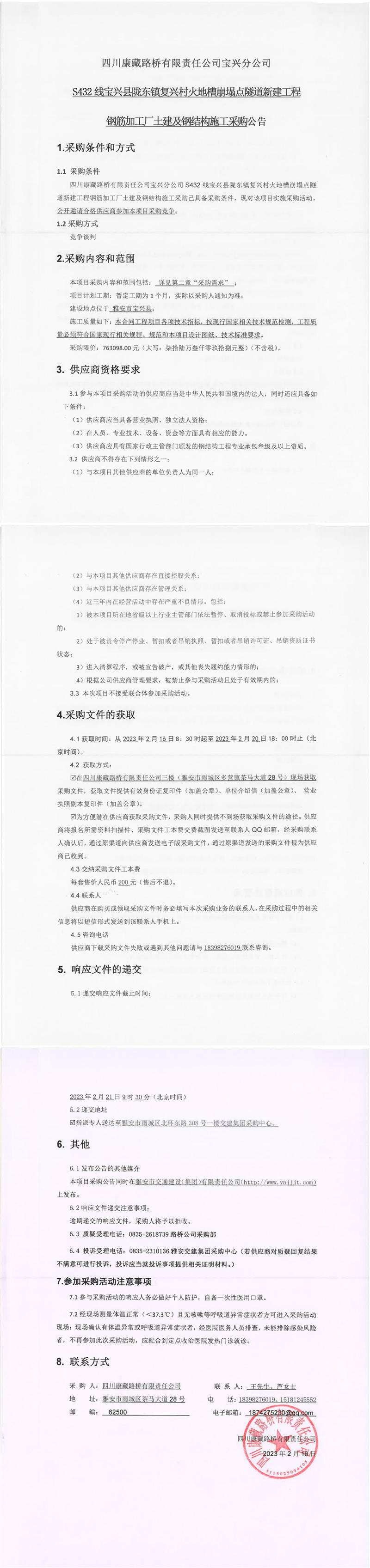 四川康藏路橋有限責(zé)任公司寶興分公司S432線寶興縣隴東鎮(zhèn)復(fù)興村火地槽崩塌點(diǎn)隧道新建工程鋼筋加工廠土建及鋼結(jié)構(gòu)施工采購(gòu)公告