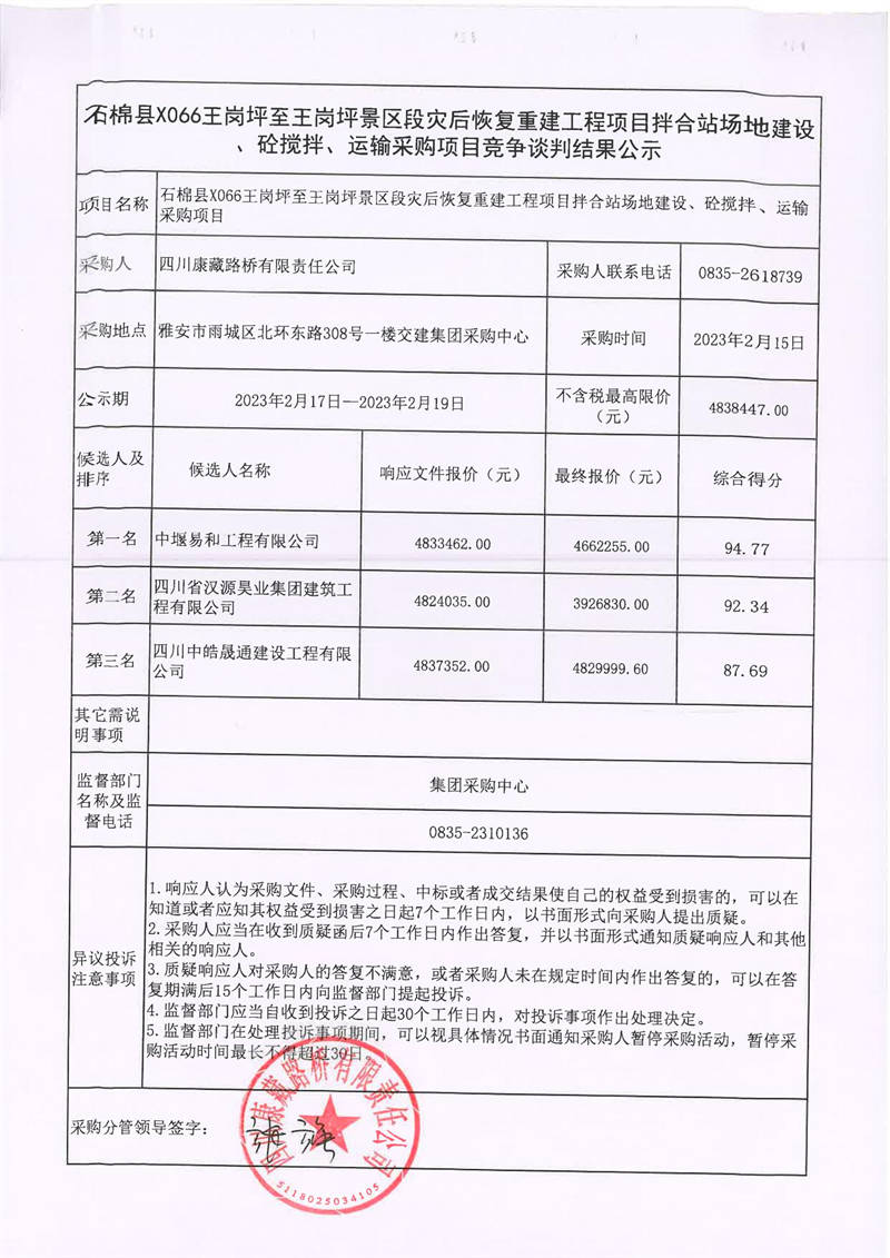 四川康藏路橋有限責任公司石棉縣X066王崗坪至王崗坪景區(qū)段災(zāi)后恢復重建工程項目拌合站場地建設(shè)、砼攪拌、運輸采購項目競爭談判結(jié)果公示