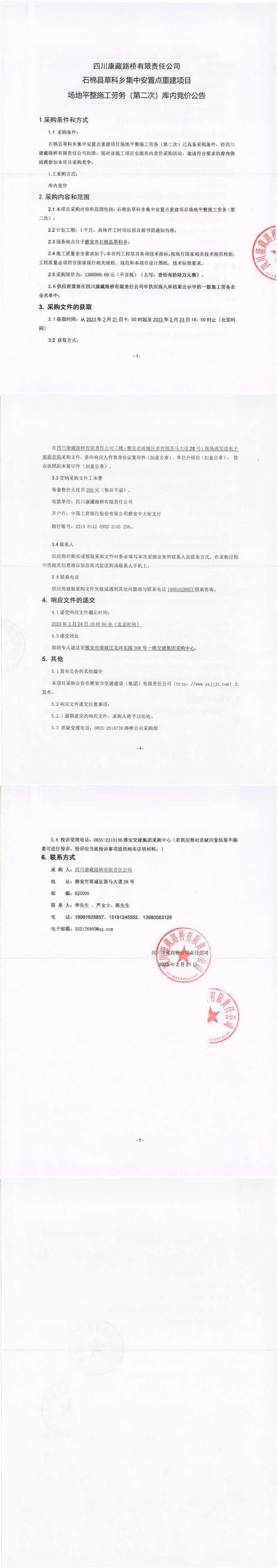 四川康藏路橋有限責任公司石棉草科鄉(xiāng)集中安置點重建項目場地平整施工勞務(第二次)庫內競價公告