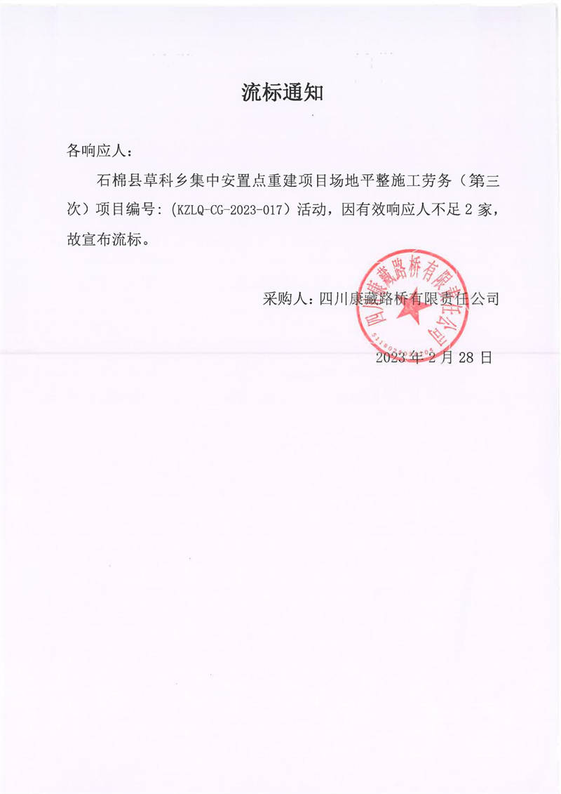 四川康藏路橋有限責任公司石棉草科鄉(xiāng)集中安置點重建項目場地平整施工勞務(wù)(第三次)庫內(nèi)競價流標通知