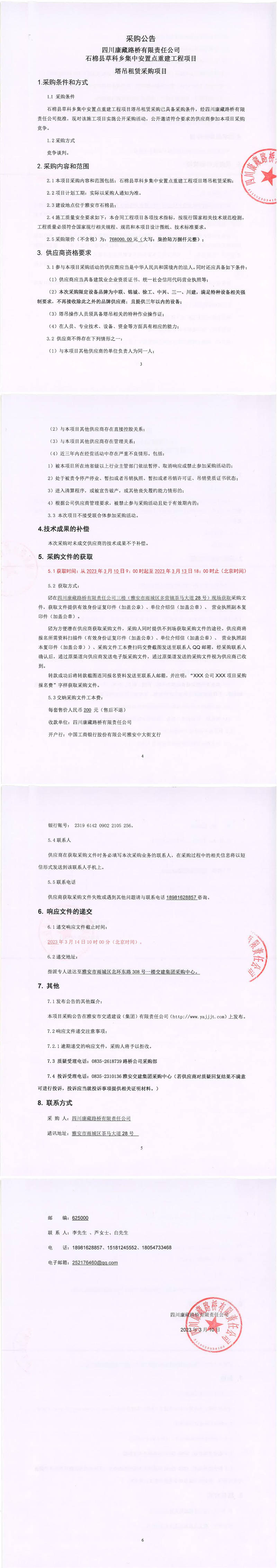 四川康藏路橋有限責(zé)任公司石棉縣草科鄉(xiāng)集中安置點(diǎn)重建工程項(xiàng)目塔吊租賃采購公告