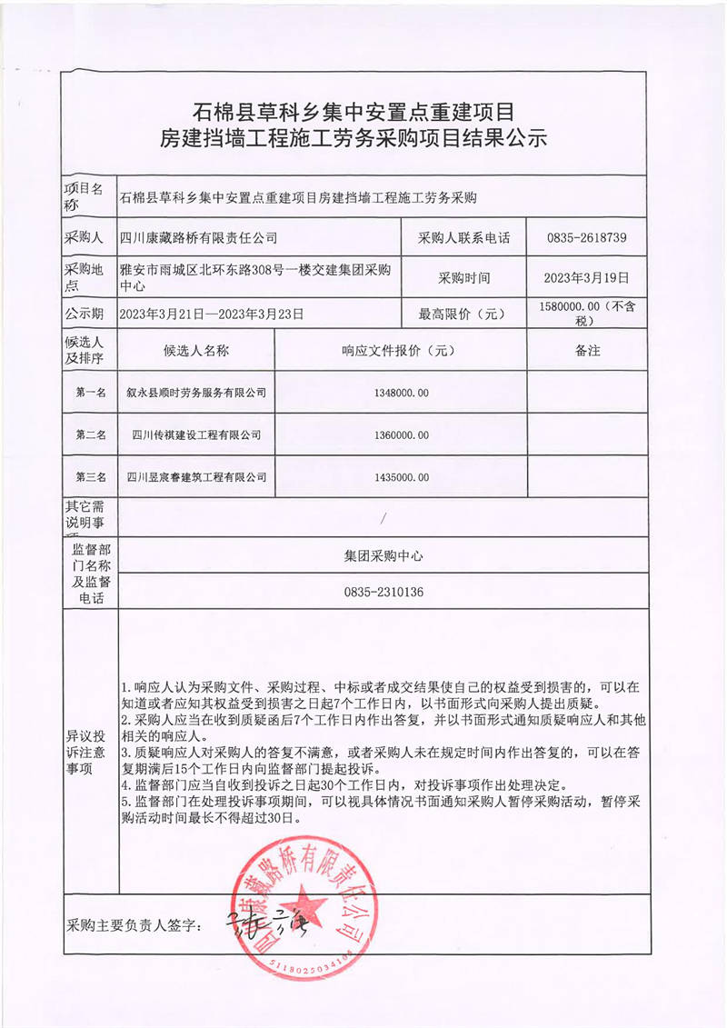 四川康藏路橋有限責(zé)任公司石棉縣草科鄉(xiāng)集中安置點(diǎn)重建項(xiàng)目房建擋墻工程施工勞務(wù)采購(gòu)項(xiàng)目結(jié)果公示