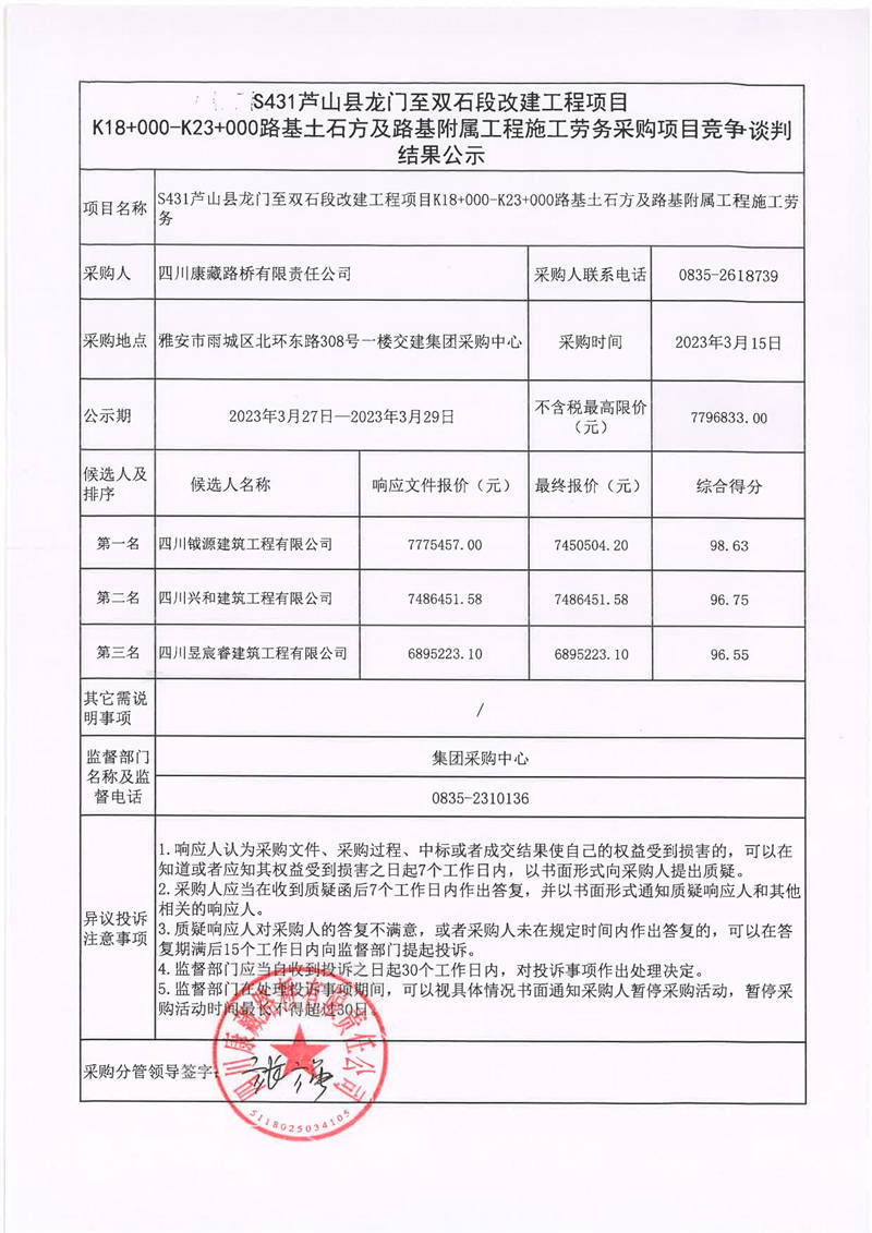 四川康藏路橋有限責任公司S431蘆山縣龍門至雙石段改建工程項目K18+000-K23+000路路基附屬工程施工勞務采購項目競爭談判結(jié)果公示