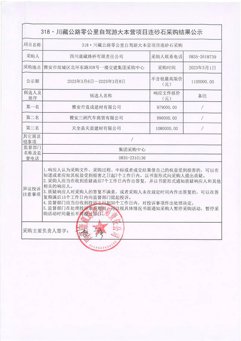 四川康藏路橋有限責任公司318·川藏公路零公里自駕游大本營項目連砂石采購結(jié)果公示