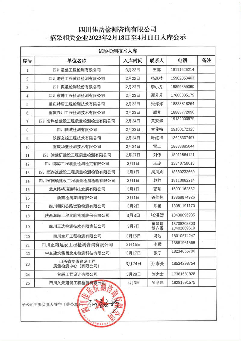 四川佳岳檢測咨詢有限公司(試驗檢測勞務供應商庫)2023年2月18日至4月11日入庫結果公示