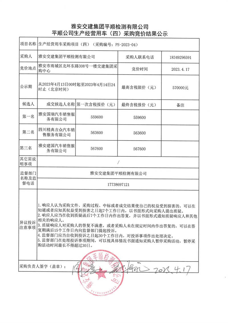 雅安交建集團(tuán)平順檢測有限公司平順公司生產(chǎn)經(jīng)營用車(四)采購競價結(jié)果公示