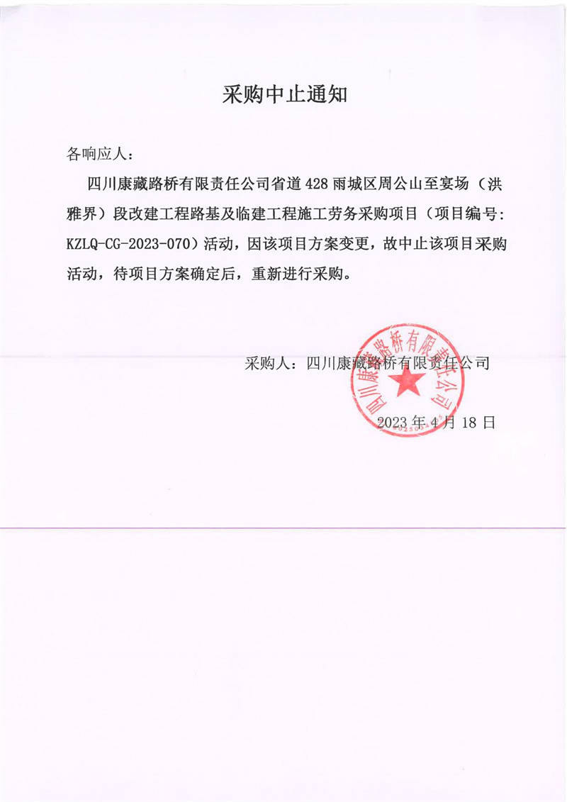 四川康藏路橋有限責任公司省道428雨城區(qū)周公山至宴場(洪雅界)段改建工程路基及臨建工程施工勞務采購項目采購中止通知